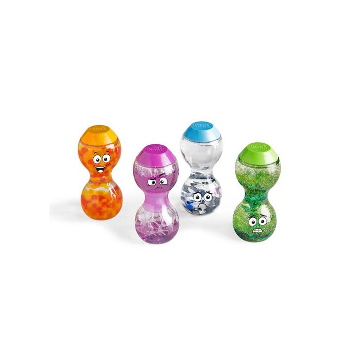 Add the Excited, Impatient, Lonely, and Nervous bottles to our other sets which are sold separately. Each bottle has a unique facial expression and colour, and the motion of its contents represent that feeling.
